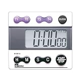 4 independent channels each of which counts up or down for any interval from 1 second to 100 hours. Extra large display indicates channels in use. Each one has a distinctive 1 minute alarm. Automatically begins to count up to indicate time elapsed after count down reaches zero. Memory recalls last timer setting or reuse. Also has a clock mode. Has a stand, pocket clip, and a magnet.